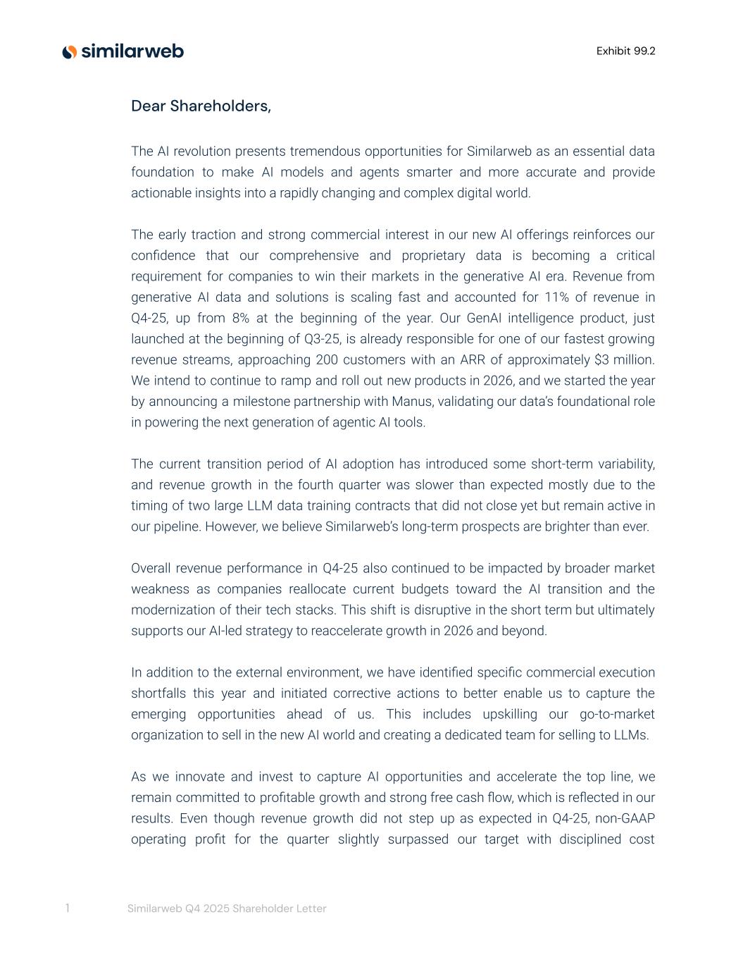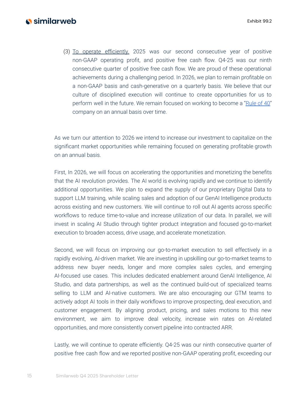 Exhibit 99.2 (3) To operate efficiently. 2025 was our second consecutive year of positive non-GAAP operating profit, and positive free cash flow. Q4-25 was our ninth consecutive quarter of positive free cash flow. We are proud of these operational achievements during a challenging period. In 2026, we plan to remain profitable on a non-GAAP basis and cash-generative on a quarterly basis. We believe that our culture of disciplined execution will continue to create opportunities for us to perform well in the future. We remain focused on working to become a “Rule of 40” company on an annual basis over time. As we turn our attention to 2026 we intend to increase our investment to capitalize on the significant market opportunities while remaining focused on generating profitable growth on an annual basis. First, In 2026, we will focus on accelerating the opportunities and monetizing the benefits that the AI revolution provides. The AI world is evolving rapidly and we continue to identify additional opportunities. We plan to expand the supply of our proprietary Digital Data to support LLM training, while scaling sales and adoption of our GenAI Intelligence products across existing and new customers. We will continue to roll out AI agents across specific workflows to reduce time-to-value and increase utilization of our data. In parallel, we will invest in scaling AI Studio through tighter product integration and focused go-to-market execution to broaden access, drive usage, and accelerate monetization. Second, we will focus on improving our go-to-market execution to sell effectively in a rapidly evolving, AI-driven market. We are investing in upskilling our go-to-market teams to address new buyer needs, longer and more complex sales cycles, and emerging AI-focused use cases. This includes dedicated enablement around GenAI Intelligence, AI Studio, and data partnerships, as well as the continued build-out of specialized teams selling to LLM and AI-native customers. We are also encouraging our GTM teams to actively adopt AI tools in their daily workflows to improve prospecting, deal execution, and customer engagement. By aligning product, pricing, and sales motions to this new environment, we aim to improve deal velocity, increase win rates on AI-related opportunities, and more consistently convert pipeline into contracted ARR. Lastly, we will continue to operate efficiently. Q4-25 was our ninth consecutive quarter of positive free cash flow and we reported positive non-GAAP operating profit, exceeding our 15 Similarweb Q4 2025 Shareholder Letter