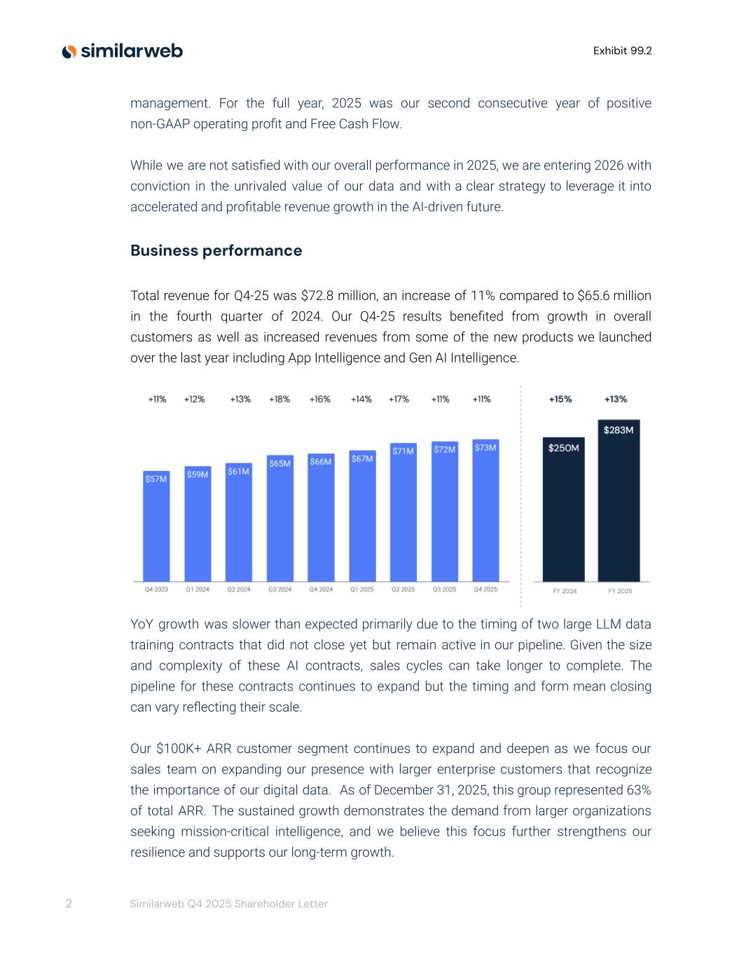 Exhibit 99.2 management. For the full year, 2025 was our second consecutive year of positive non-GAAP operating profit and Free Cash Flow. While we are not satisfied with our overall performance in 2025, we are entering 2026 with conviction in the unrivaled value of our data and with a clear strategy to leverage it into accelerated and profitable revenue growth in the AI-driven future. Business performance Total revenue for Q4-25 was $72.8 million, an increase of 11% compared to $65.6 million in the fourth quarter of 2024. Our Q4-25 results benefited from growth in overall customers as well as increased revenues from some of the new products we launched over the last year including App Intelligence and Gen AI Intelligence. YoY growth was slower than expected primarily due to the timing of two large LLM data training contracts that did not close yet but remain active in our pipeline. Given the size and complexity of these AI contracts, sales cycles can take longer to complete. The pipeline for these contracts continues to expand but the timing and form mean closing can vary reflecting their scale. Our $100K+ ARR customer segment continues to expand and deepen as we focus our sales team on expanding our presence with larger enterprise customers that recognize the importance of our digital data. As of December 31, 2025, this group represented 63% of total ARR. The sustained growth demonstrates the demand from larger organizations seeking mission-critical intelligence, and we believe this focus further strengthens our resilience and supports our long-term growth. 2 Similarweb Q4 2025 Shareholder Letter