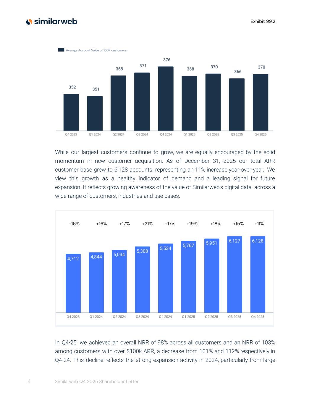 Exhibit 99.2 While our largest customers continue to grow, we are equally encouraged by the solid momentum in new customer acquisition. As of December 31, 2025 our total ARR customer base grew to 6,128 accounts, representing an 11% increase year-over-year. We view this growth as a healthy indicator of demand and a leading signal for future expansion. It reflects growing awareness of the value of Similarweb’s digital data across a wide range of customers, industries and use cases. In Q4-25, we achieved an overall NRR of 98% across all customers and an NRR of 103% among customers with over $100k ARR, a decrease from 101% and 112% respectively in Q4-24. This decline reflects the strong expansion activity in 2024, particularly from large 4 Similarweb Q4 2025 Shareholder Letter