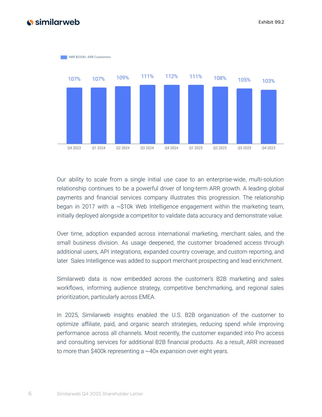 Exhibit 99.2 Our ability to scale from a single initial use case to an enterprise-wide, multi-solution relationship continues to be a powerful driver of long-term ARR growth. A leading global payments and financial services company illustrates this progression. The relationship began in 2017 with a ~$10k Web Intelligence engagement within the marketing team, initially deployed alongside a competitor to validate data accuracy and demonstrate value. Over time, adoption expanded across international marketing, merchant sales, and the small business division. As usage deepened, the customer broadened access through additional users, API integrations, expanded country coverage, and custom reporting, and later Sales Intelligence was added to support merchant prospecting and lead enrichment. Similarweb data is now embedded across the customer’s B2B marketing and sales workflows, informing audience strategy, competitive benchmarking, and regional sales prioritization, particularly across EMEA. In 2025, Similarweb insights enabled the U.S. B2B organization of the customer to optimize affiliate, paid, and organic search strategies, reducing spend while improving performance across all channels. Most recently, the customer expanded into Pro access and consulting services for additional B2B financial products. As a result, ARR increased to more than $400k representing a ~40x expansion over eight years. 6 Similarweb Q4 2025 Shareholder Letter