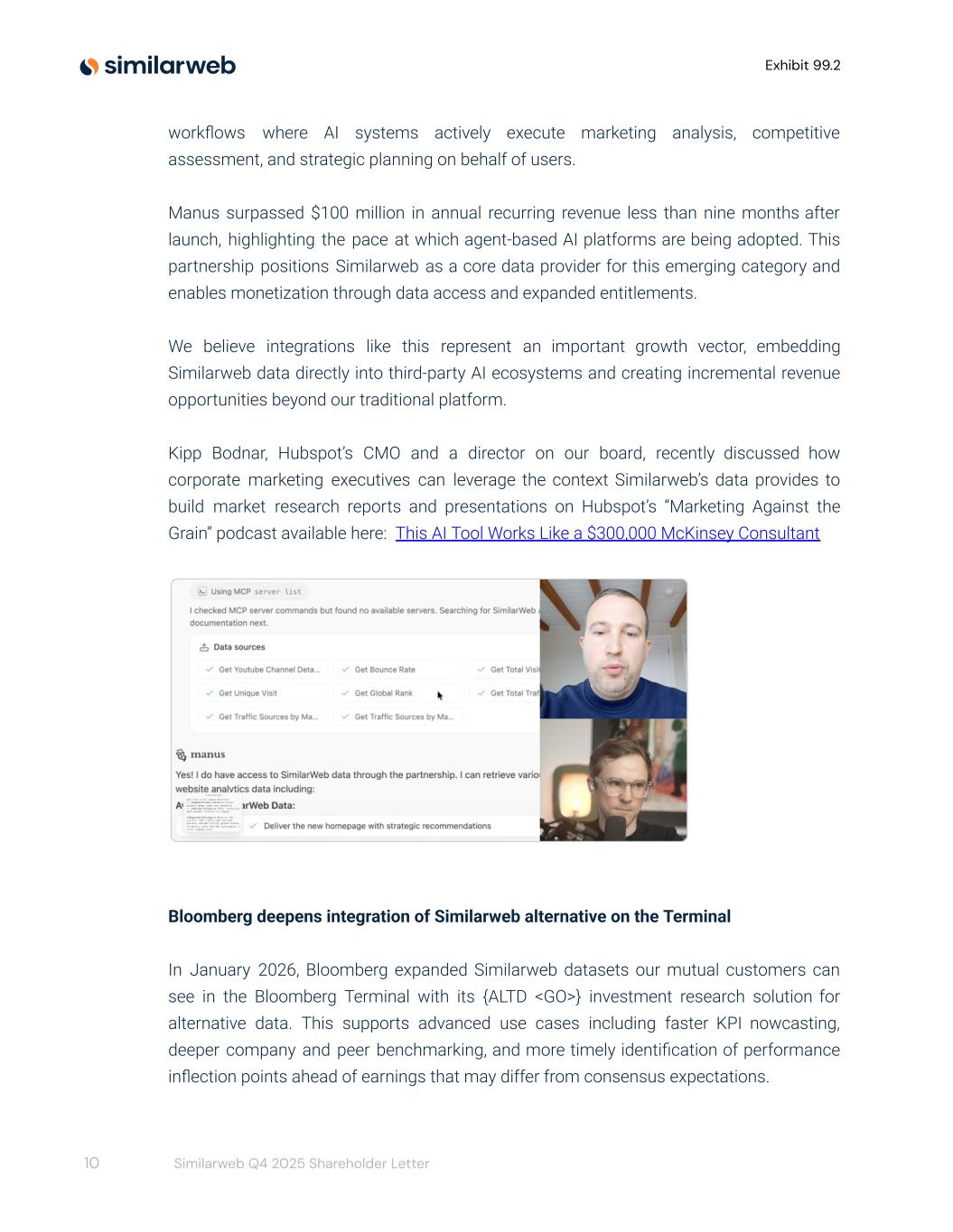 Exhibit 99.2 workflows where AI systems actively execute marketing analysis, competitive assessment, and strategic planning on behalf of users. Manus surpassed $100 million in annual recurring revenue less than nine months after launch, highlighting the pace at which agent-based AI platforms are being adopted. This partnership positions Similarweb as a core data provider for this emerging category and enables monetization through data access and expanded entitlements. We believe integrations like this represent an important growth vector, embedding Similarweb data directly into third-party AI ecosystems and creating incremental revenue opportunities beyond our traditional platform. Kipp Bodnar, Hubspot’s CMO and a director on our board, recently discussed how corporate marketing executives can leverage the context Similarweb’s data provides to build market research reports and presentations on Hubspot’s “Marketing Against the Grain” podcast available here: This AI Tool Works Like a $300,000 McKinsey Consultant Bloomberg deepens integration of Similarweb alternative on the Terminal In January 2026, Bloomberg expanded Similarweb datasets our mutual customers can see in the Bloomberg Terminal with its {ALTD <GO>} investment research solution for alternative data. This supports advanced use cases including faster KPI nowcasting, deeper company and peer benchmarking, and more timely identification of performance inflection points ahead of earnings that may differ from consensus expectations. 10 Similarweb Q4 2025 Shareholder Letter