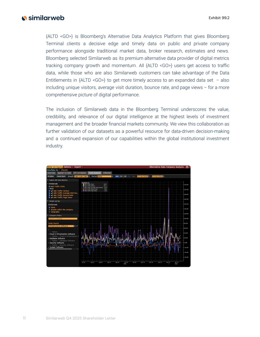 Exhibit 99.2 {ALTD <GO>} is Bloomberg’s Alternative Data Analytics Platform that gives Bloomberg Terminal clients a decisive edge and timely data on public and private company performance alongside traditional market data, broker research, estimates and news. Bloomberg selected Similarweb as its premium alternative data provider of digital metrics tracking company growth and momentum. All {ALTD <GO>} users get access to traffic data, while those who are also Similarweb customers can take advantage of the Data Entitlements in {ALTD <GO>} to get more timely access to an expanded data set – also including unique visitors, average visit duration, bounce rate, and page views – for a more comprehensive picture of digital performance. The inclusion of Similarweb data in the Bloomberg Terminal underscores the value, credibility, and relevance of our digital intelligence at the highest levels of investment management and the broader financial markets community. We view this collaboration as further validation of our datasets as a powerful resource for data-driven decision-making and a continued expansion of our capabilities within the global institutional investment industry. 11 Similarweb Q4 2025 Shareholder Letter