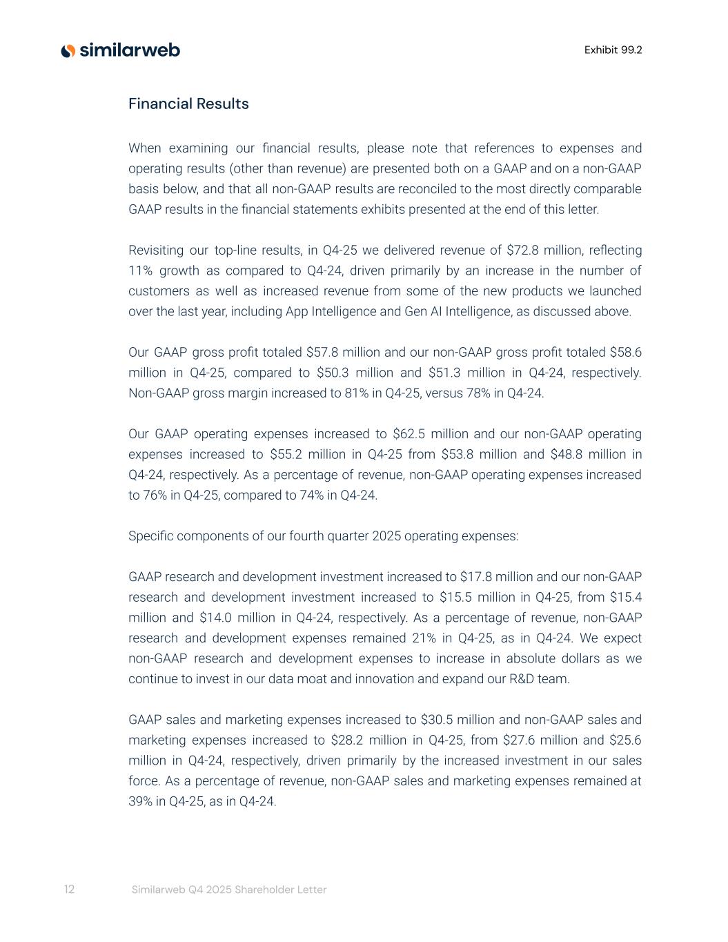 Exhibit 99.2 Financial Results When examining our financial results, please note that references to expenses and operating results (other than revenue) are presented both on a GAAP and on a non-GAAP basis below, and that all non-GAAP results are reconciled to the most directly comparable GAAP results in the financial statements exhibits presented at the end of this letter. Revisiting our top-line results, in Q4-25 we delivered revenue of $72.8 million, reflecting 11% growth as compared to Q4-24, driven primarily by an increase in the number of customers as well as increased revenue from some of the new products we launched over the last year, including App Intelligence and Gen AI Intelligence, as discussed above. Our GAAP gross profit totaled $57.8 million and our non-GAAP gross profit totaled $58.6 million in Q4-25, compared to $50.3 million and $51.3 million in Q4-24, respectively. Non-GAAP gross margin increased to 81% in Q4-25, versus 78% in Q4-24. Our GAAP operating expenses increased to $62.5 million and our non-GAAP operating expenses increased to $55.2 million in Q4-25 from $53.8 million and $48.8 million in Q4-24, respectively. As a percentage of revenue, non-GAAP operating expenses increased to 76% in Q4-25, compared to 74% in Q4-24. Specific components of our fourth quarter 2025 operating expenses: GAAP research and development investment increased to $17.8 million and our non-GAAP research and development investment increased to $15.5 million in Q4-25, from $15.4 million and $14.0 million in Q4-24, respectively. As a percentage of revenue, non-GAAP research and development expenses remained 21% in Q4-25, as in Q4-24. We expect non-GAAP research and development expenses to increase in absolute dollars as we continue to invest in our data moat and innovation and expand our R&D team. GAAP sales and marketing expenses increased to $30.5 million and non-GAAP sales and marketing expenses increased to $28.2 million in Q4-25, from $27.6 million and $25.6 million in Q4-24, respectively, driven primarily by the increased investment in our sales force. As a percentage of revenue, non-GAAP sales and marketing expenses remained at 39% in Q4-25, as in Q4-24. 12 Similarweb Q4 2025 Shareholder Letter