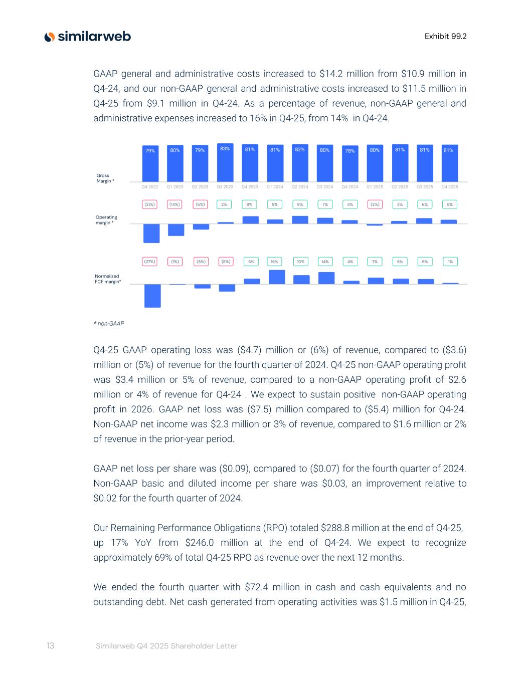 Exhibit 99.2 GAAP general and administrative costs increased to $14.2 million from $10.9 million in Q4-24, and our non-GAAP general and administrative costs increased to $11.5 million in Q4-25 from $9.1 million in Q4-24. As a percentage of revenue, non-GAAP general and administrative expenses increased to 16% in Q4-25, from 14% in Q4-24. * non-GAAP Q4-25 GAAP operating loss was ($4.7) million or (6%) of revenue, compared to ($3.6) million or (5%) of revenue for the fourth quarter of 2024. Q4-25 non-GAAP operating profit was $3.4 million or 5% of revenue, compared to a non-GAAP operating profit of $2.6 million or 4% of revenue for Q4-24 . We expect to sustain positive non-GAAP operating profit in 2026. GAAP net loss was ($7.5) million compared to ($5.4) million for Q4-24. Non-GAAP net income was $2.3 million or 3% of revenue, compared to $1.6 million or 2% of revenue in the prior-year period. GAAP net loss per share was ($0.09), compared to ($0.07) for the fourth quarter of 2024. Non-GAAP basic and diluted income per share was $0.03, an improvement relative to $0.02 for the fourth quarter of 2024. Our Remaining Performance Obligations (RPO) totaled $288.8 million at the end of Q4-25, up 17% YoY from $246.0 million at the end of Q4-24. We expect to recognize approximately 69% of total Q4-25 RPO as revenue over the next 12 months. We ended the fourth quarter with $72.4 million in cash and cash equivalents and no outstanding debt. Net cash generated from operating activities was $1.5 million in Q4-25, 13 Similarweb Q4 2025 Shareholder Letter