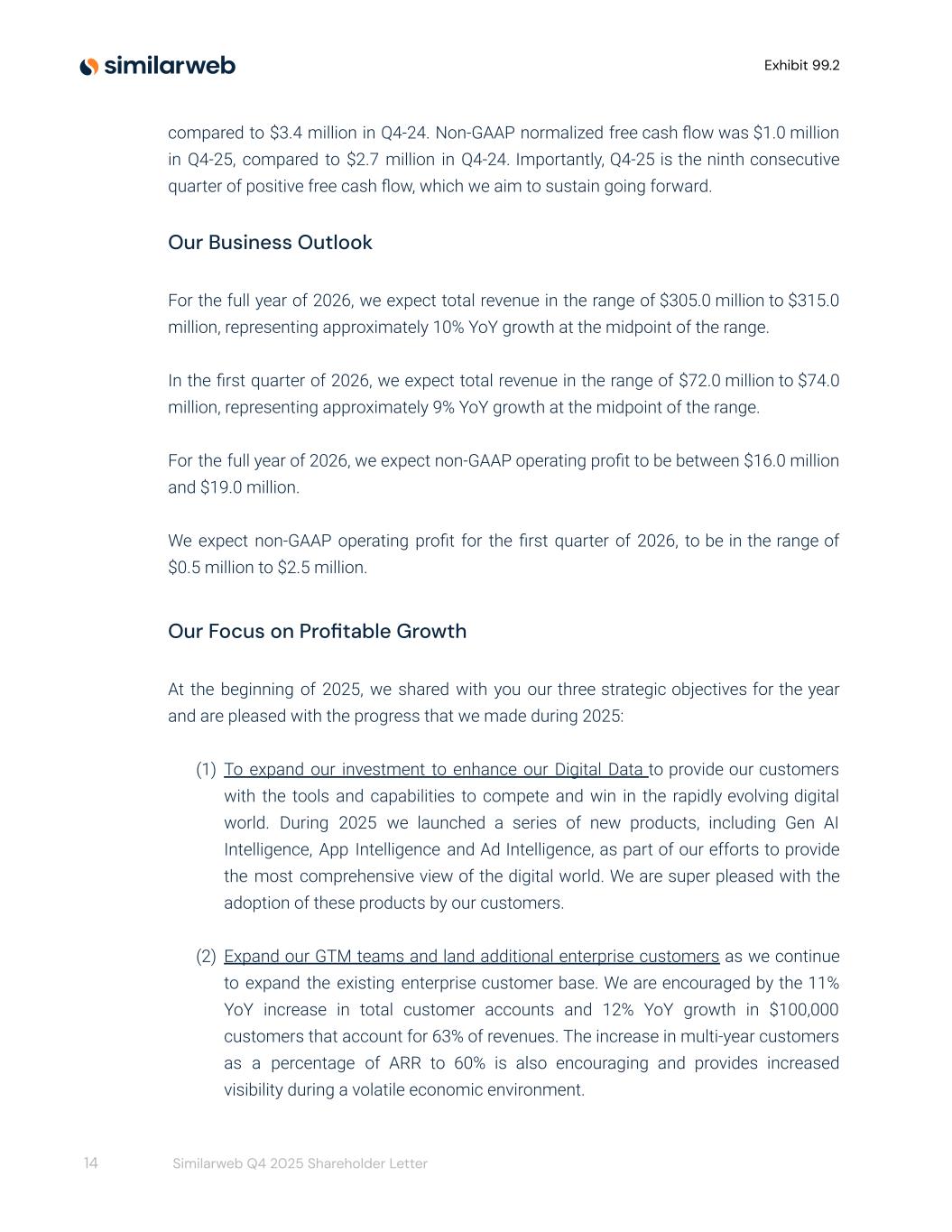 Exhibit 99.2 compared to $3.4 million in Q4-24. Non-GAAP normalized free cash flow was $1.0 million in Q4-25, compared to $2.7 million in Q4-24. Importantly, Q4-25 is the ninth consecutive quarter of positive free cash flow, which we aim to sustain going forward. Our Business Outlook For the full year of 2026, we expect total revenue in the range of $305.0 million to $315.0 million, representing approximately 10% YoY growth at the midpoint of the range. In the first quarter of 2026, we expect total revenue in the range of $72.0 million to $74.0 million, representing approximately 9% YoY growth at the midpoint of the range. For the full year of 2026, we expect non-GAAP operating profit to be between $16.0 million and $19.0 million. We expect non-GAAP operating profit for the first quarter of 2026, to be in the range of $0.5 million to $2.5 million. Our Focus on Profitable Growth At the beginning of 2025, we shared with you our three strategic objectives for the year and are pleased with the progress that we made during 2025: (1) To expand our investment to enhance our Digital Data to provide our customers with the tools and capabilities to compete and win in the rapidly evolving digital world. During 2025 we launched a series of new products, including Gen AI Intelligence, App Intelligence and Ad Intelligence, as part of our efforts to provide the most comprehensive view of the digital world. We are super pleased with the adoption of these products by our customers. (2) Expand our GTM teams and land additional enterprise customers as we continue to expand the existing enterprise customer base. We are encouraged by the 11% YoY increase in total customer accounts and 12% YoY growth in $100,000 customers that account for 63% of revenues. The increase in multi-year customers as a percentage of ARR to 60% is also encouraging and provides increased visibility during a volatile economic environment. 14 Similarweb Q4 2025 Shareholder Letter