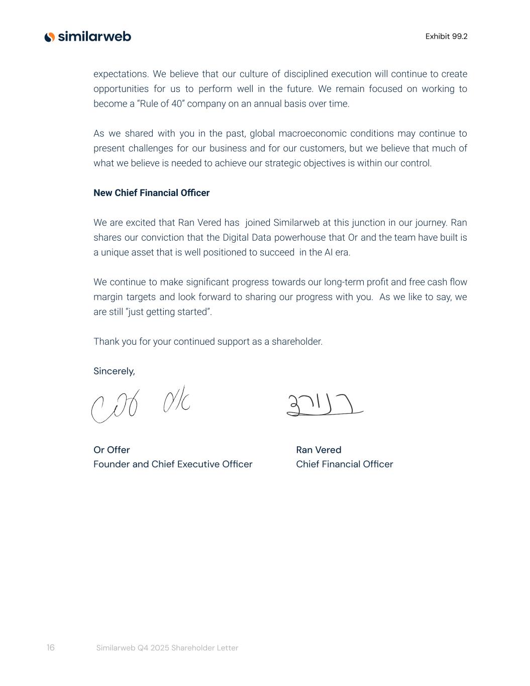 Exhibit 99.2 expectations. We believe that our culture of disciplined execution will continue to create opportunities for us to perform well in the future. We remain focused on working to become a “Rule of 40” company on an annual basis over time. As we shared with you in the past, global macroeconomic conditions may continue to present challenges for our business and for our customers, but we believe that much of what we believe is needed to achieve our strategic objectives is within our control. New Chief Financial Officer We are excited that Ran Vered has joined Similarweb at this junction in our journey. Ran shares our conviction that the Digital Data powerhouse that Or and the team have built is a unique asset that is well positioned to succeed in the AI era. We continue to make significant progress towards our long-term profit and free cash flow margin targets and look forward to sharing our progress with you. As we like to say, we are still “just getting started”. Thank you for your continued support as a shareholder. Sincerely, Or Offer Founder and Chief Executive Officer Ran Vered Chief Financial Officer 16 Similarweb Q4 2025 Shareholder Letter