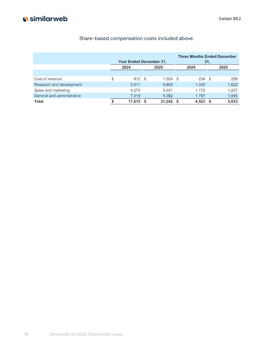 Exhibit 99.2 Share-based compensation costs included above: 19 Similarweb Q4 2025 Shareholder Letter
