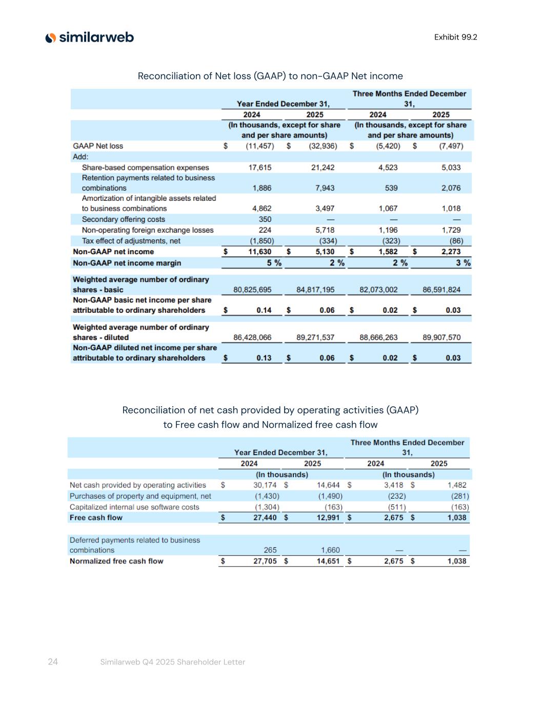 Exhibit 99.2 Reconciliation of Net loss (GAAP) to non-GAAP Net income Reconciliation of net cash provided by operating activities (GAAP) to Free cash flow and Normalized free cash flow 24 Similarweb Q4 2025 Shareholder Letter