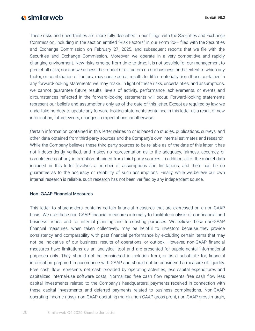 Exhibit 99.2 These risks and uncertainties are more fully described in our filings with the Securities and Exchange Commission, including in the section entitled “Risk Factors” in our Form 20-F filed with the Securities and Exchange Commission on February 27, 2025, and subsequent reports that we file with the Securities and Exchange Commission. Moreover, we operate in a very competitive and rapidly changing environment. New risks emerge from time to time. It is not possible for our management to predict all risks, nor can we assess the impact of all factors on our business or the extent to which any factor, or combination of factors, may cause actual results to differ materially from those contained in any forward-looking statements we may make. In light of these risks, uncertainties, and assumptions, we cannot guarantee future results, levels of activity, performance, achievements, or events and circumstances reflected in the forward-looking statements will occur. Forward-looking statements represent our beliefs and assumptions only as of the date of this letter. Except as required by law, we undertake no duty to update any forward-looking statements contained in this letter as a result of new information, future events, changes in expectations, or otherwise. Certain information contained in this letter relates to or is based on studies, publications, surveys, and other data obtained from third-party sources and the Company's own internal estimates and research. While the Company believes these third-party sources to be reliable as of the date of this letter, it has not independently verified, and makes no representation as to the adequacy, fairness, accuracy, or completeness of any information obtained from third-party sources. In addition, all of the market data included in this letter involves a number of assumptions and limitations, and there can be no guarantee as to the accuracy or reliability of such assumptions. Finally, while we believe our own internal research is reliable, such research has not been verified by any independent source. Non-GAAP Financial Measures This letter to shareholders contains certain financial measures that are expressed on a non-GAAP basis. We use these non-GAAP financial measures internally to facilitate analysis of our financial and business trends and for internal planning and forecasting purposes. We believe these non-GAAP financial measures, when taken collectively, may be helpful to investors because they provide consistency and comparability with past financial performance by excluding certain items that may not be indicative of our business, results of operations, or outlook. However, non-GAAP financial measures have limitations as an analytical tool and are presented for supplemental informational purposes only. They should not be considered in isolation from, or as a substitute for, financial information prepared in accordance with GAAP and should not be considered a measure of liquidity. Free cash flow represents net cash provided by operating activities, less capital expenditures and capitalized internal-use software costs. Normalized free cash flow represents free cash flow less capital investments related to the Company's headquarters, payments received in connection with these capital investments and deferred payments related to business combinations. Non-GAAP operating income (loss), non-GAAP operating margin, non-GAAP gross profit, non-GAAP gross margin, 26 Similarweb Q4 2025 Shareholder Letter