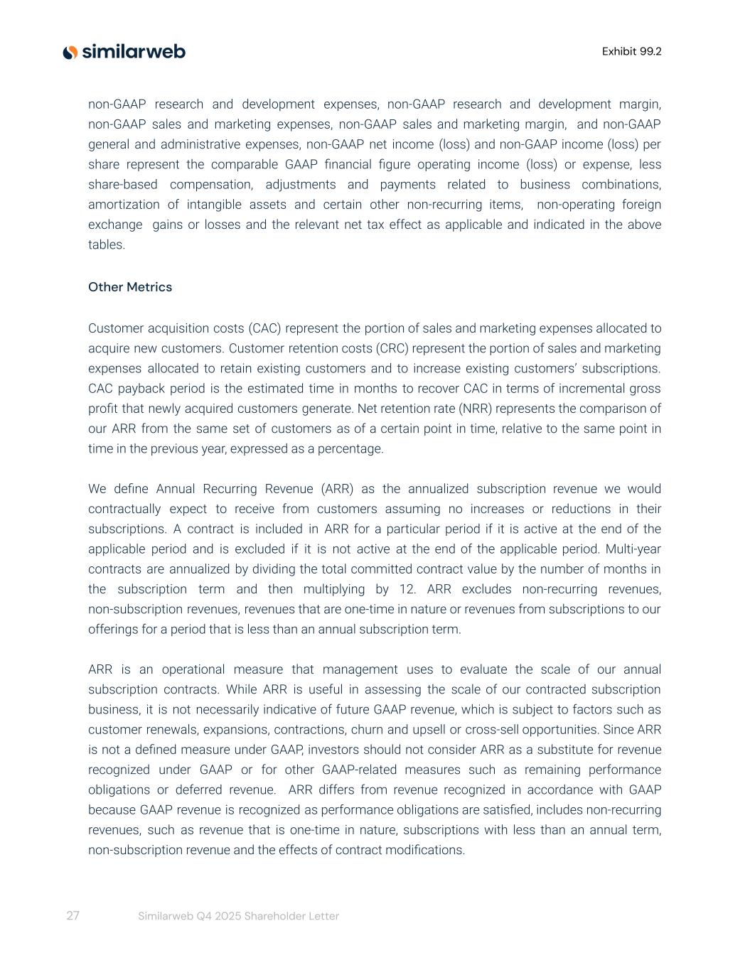 Exhibit 99.2 non-GAAP research and development expenses, non-GAAP research and development margin, non-GAAP sales and marketing expenses, non-GAAP sales and marketing margin, and non-GAAP general and administrative expenses, non-GAAP net income (loss) and non-GAAP income (loss) per share represent the comparable GAAP financial figure operating income (loss) or expense, less share-based compensation, adjustments and payments related to business combinations, amortization of intangible assets and certain other non-recurring items, non-operating foreign exchange gains or losses and the relevant net tax effect as applicable and indicated in the above tables. Other Metrics Customer acquisition costs (CAC) represent the portion of sales and marketing expenses allocated to acquire new customers. Customer retention costs (CRC) represent the portion of sales and marketing expenses allocated to retain existing customers and to increase existing customers’ subscriptions. CAC payback period is the estimated time in months to recover CAC in terms of incremental gross profit that newly acquired customers generate. Net retention rate (NRR) represents the comparison of our ARR from the same set of customers as of a certain point in time, relative to the same point in time in the previous year, expressed as a percentage. We define Annual Recurring Revenue (ARR) as the annualized subscription revenue we would contractually expect to receive from customers assuming no increases or reductions in their subscriptions. A contract is included in ARR for a particular period if it is active at the end of the applicable period and is excluded if it is not active at the end of the applicable period. Multi-year contracts are annualized by dividing the total committed contract value by the number of months in the subscription term and then multiplying by 12. ARR excludes non-recurring revenues, non-subscription revenues, revenues that are one-time in nature or revenues from subscriptions to our offerings for a period that is less than an annual subscription term. ARR is an operational measure that management uses to evaluate the scale of our annual subscription contracts. While ARR is useful in assessing the scale of our contracted subscription business, it is not necessarily indicative of future GAAP revenue, which is subject to factors such as customer renewals, expansions, contractions, churn and upsell or cross-sell opportunities. Since ARR is not a defined measure under GAAP, investors should not consider ARR as a substitute for revenue recognized under GAAP or for other GAAP-related measures such as remaining performance obligations or deferred revenue. ARR differs from revenue recognized in accordance with GAAP because GAAP revenue is recognized as performance obligations are satisfied, includes non-recurring revenues, such as revenue that is one-time in nature, subscriptions with less than an annual term, non-subscription revenue and the effects of contract modifications. 27 Similarweb Q4 2025 Shareholder Letter